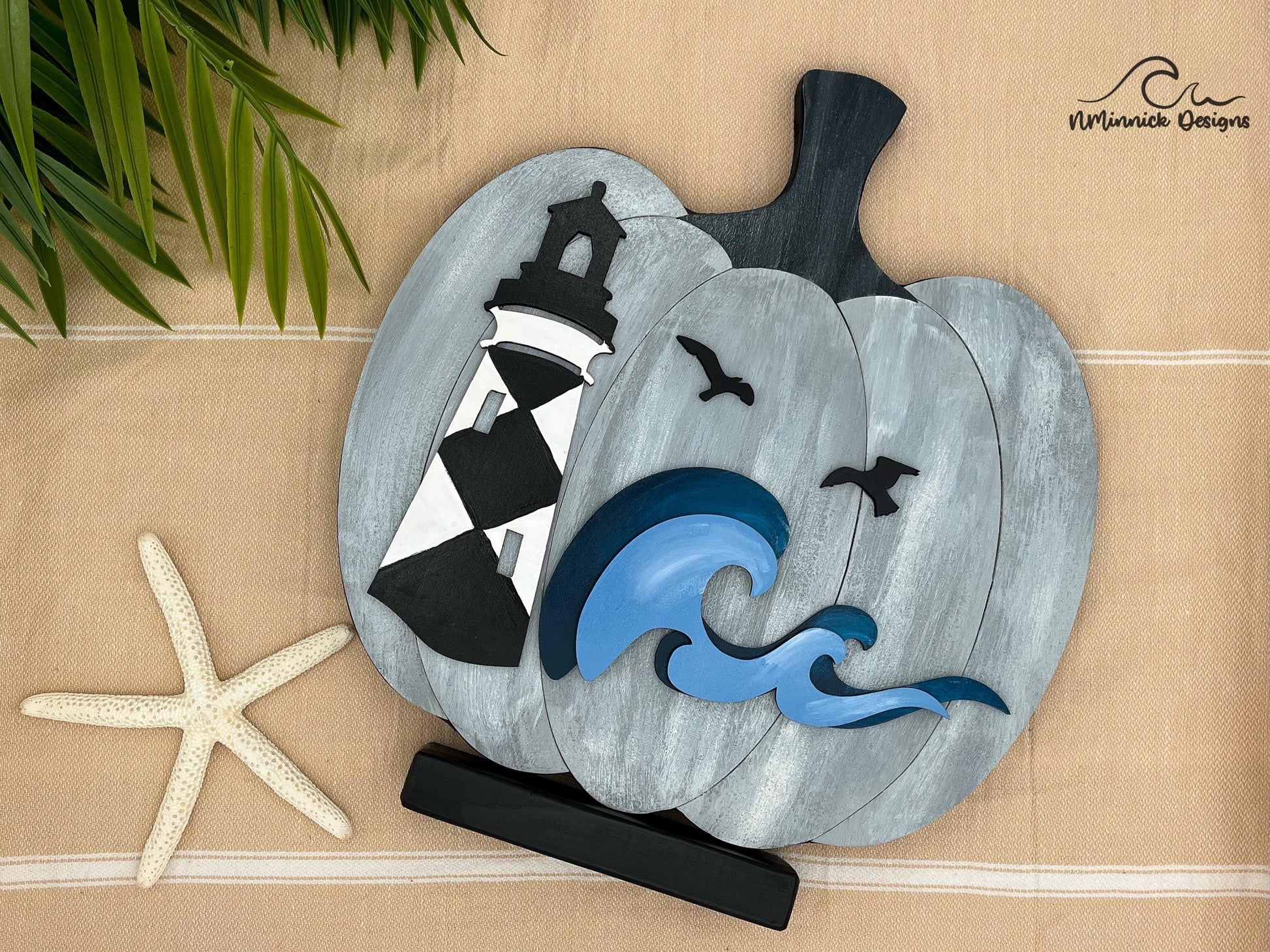 Elevate your coastal decor with our Coastal Wood Pumpkin. Choose from the elegant Hatteras-inspired Swirl Lighthouse or charming Cape Lookout-inspired Diamond Lady Lighthouse pattern standing on the shore of 3D tranquil blue waves and soaring seagulls. This handcrafted piece effortlessly captures the timeless beauty of seaside living for a unique seasonal accent.